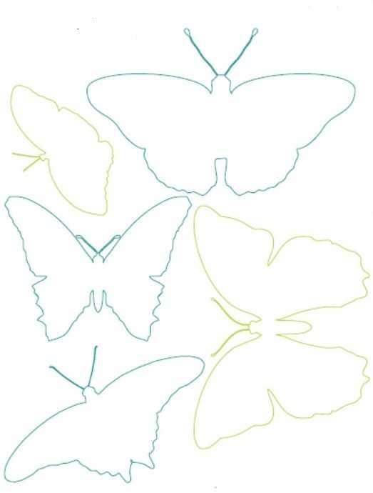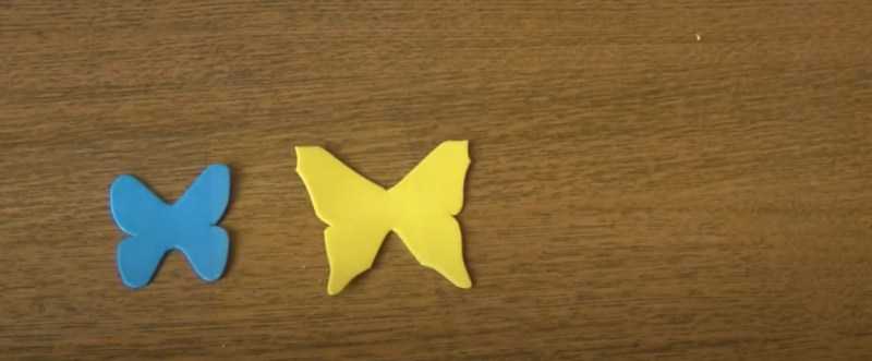 Для начала на сгибе листа изображают половину контура нужной бабочки и вырезают. Далее шаблон прикладывают на нужный лист фоамирана и, слегка надавливая, обводят зубочисткой, после чего необходимые элементы вырезают.