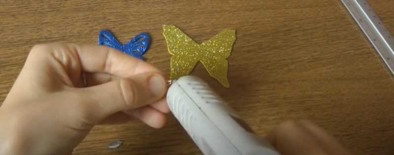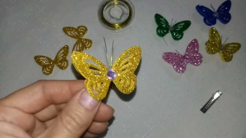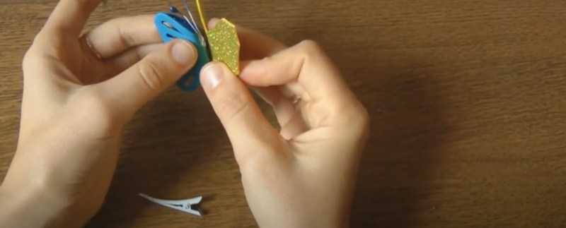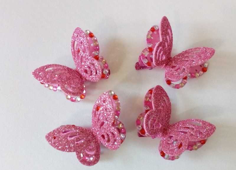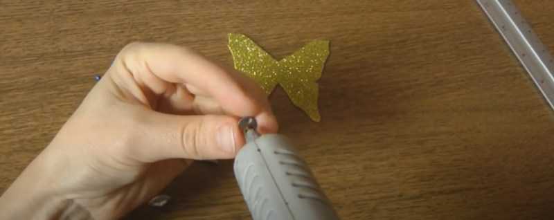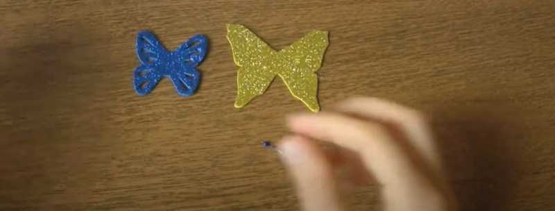 И в этом случае лучшим решением будет приклеивание к имеющейся основе под бабочку пары продолговатых бусин, заменяющих туловище, которые можно, как и сами крылья, покрыть блестками.