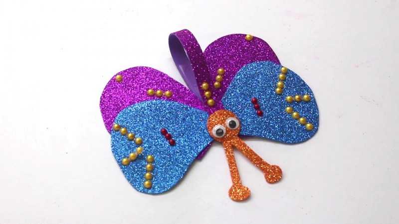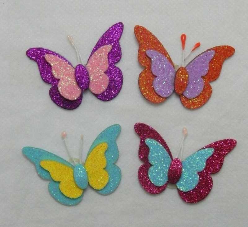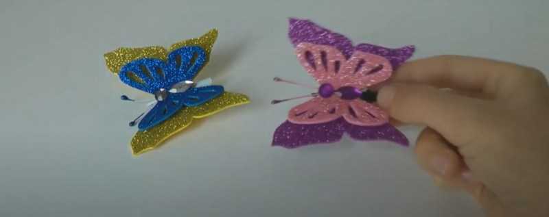 На разведенные концы нанизывают еще 2 бусинки и закручивают так, чтобы они не упали. После этого бабочка готова и обещанный впечатляющий результат от сочетания материалов, хорошо заметен на фото бабочки из фоамирана с мерцающим покрытием.