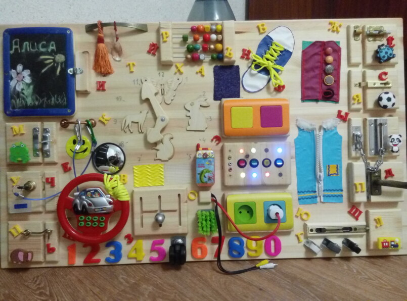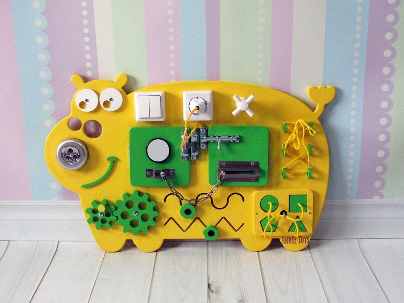 Доска или куб с разными функциональными предметами – от выключателей до шнуровки – прекрасная игрушка для юного исследователя. Выбирая бизиборд, важно не переусердствовать с наполнением, ведь множество деталей не даст сосредоточиться.