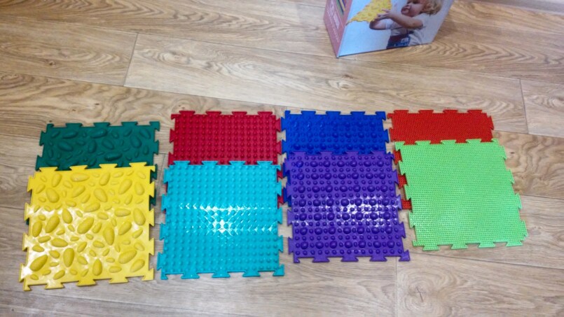 Наборы ковриков с покрытием разной жесткости используют для массажа стоп в лечебных и профилактических целях. Модули крепятся между собой как пазл, поэтому ребенок может собирать их самостоятельно, и полезное дело превращается в увлекательную игру.