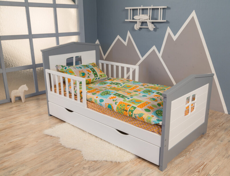 2 года – отличный возраст, чтобы поменять детскую кроватку на кровать с бортиком. Интересным решением будет кровать с каркасом для полога, где ребенок сможет закрыться, как в шалаше.