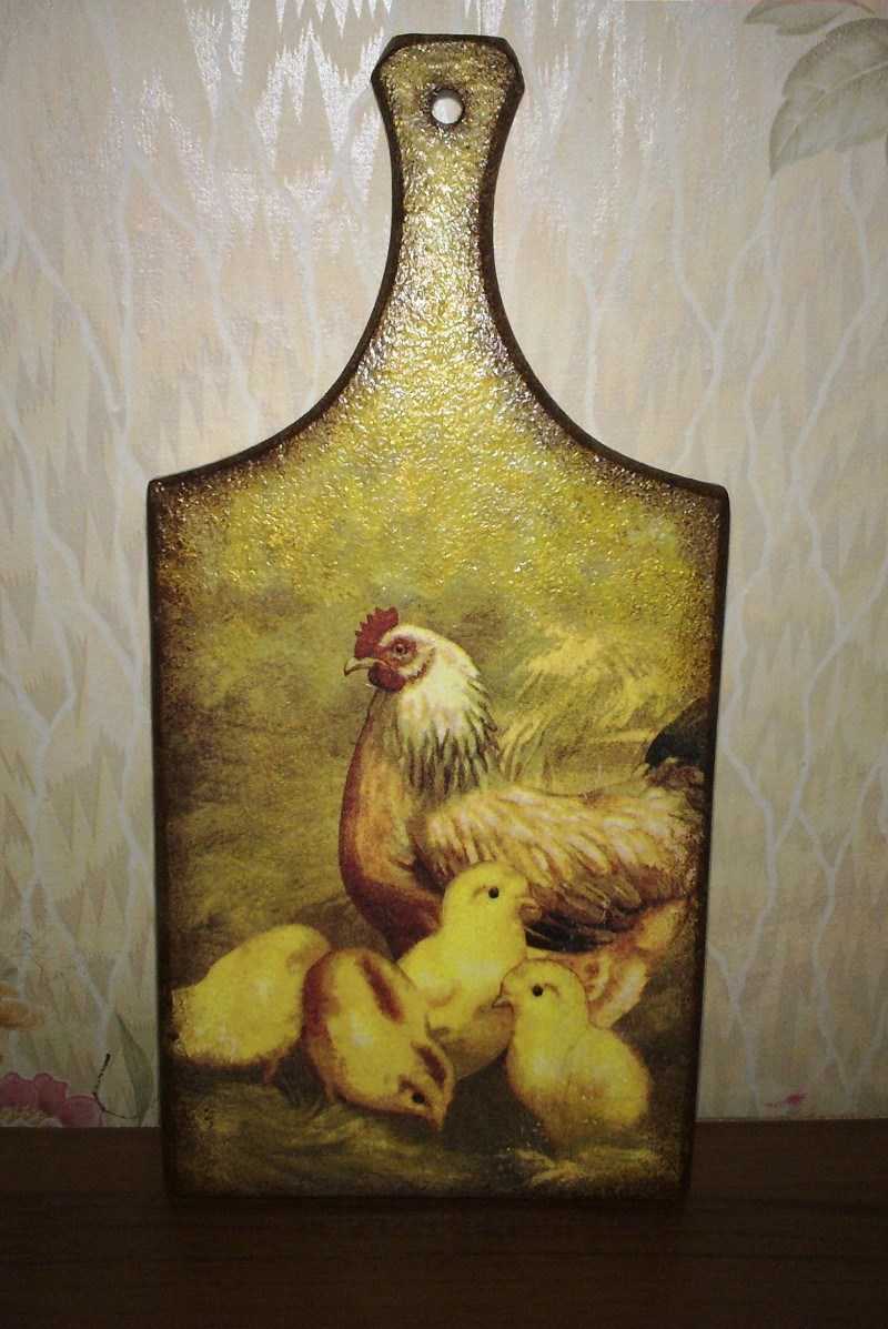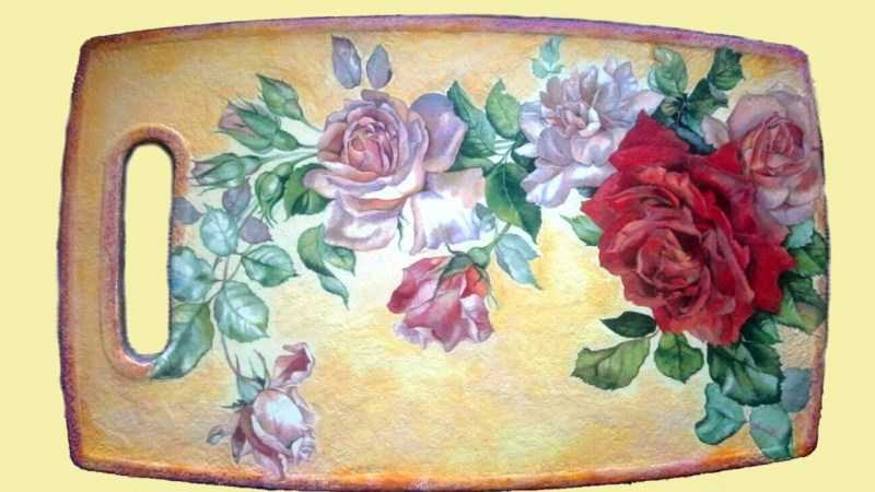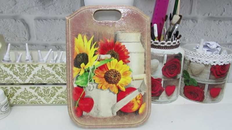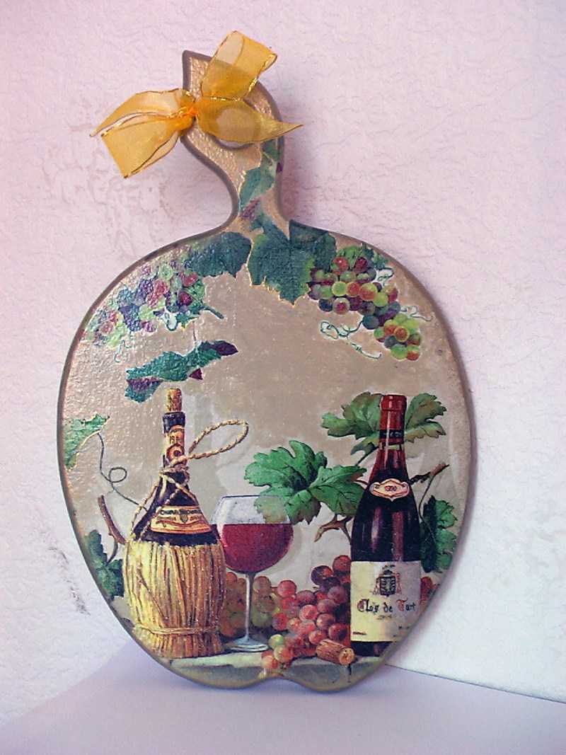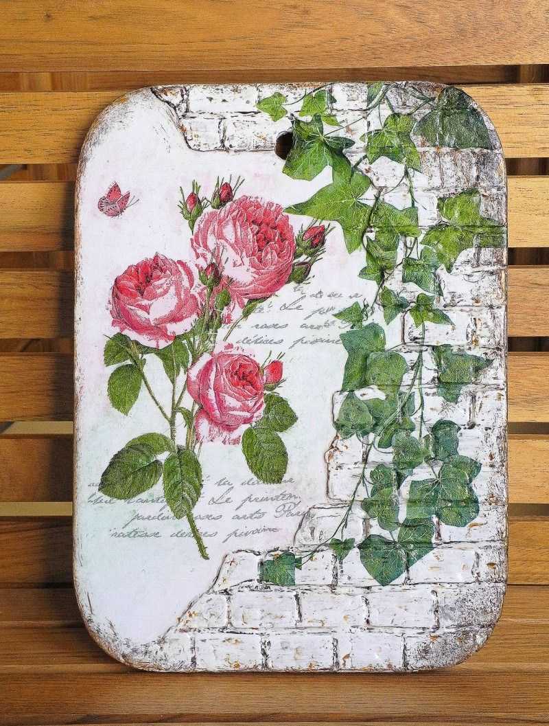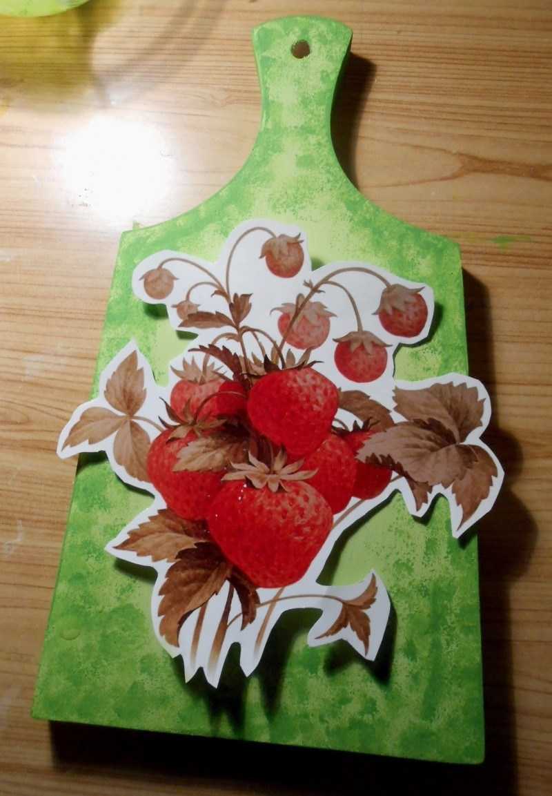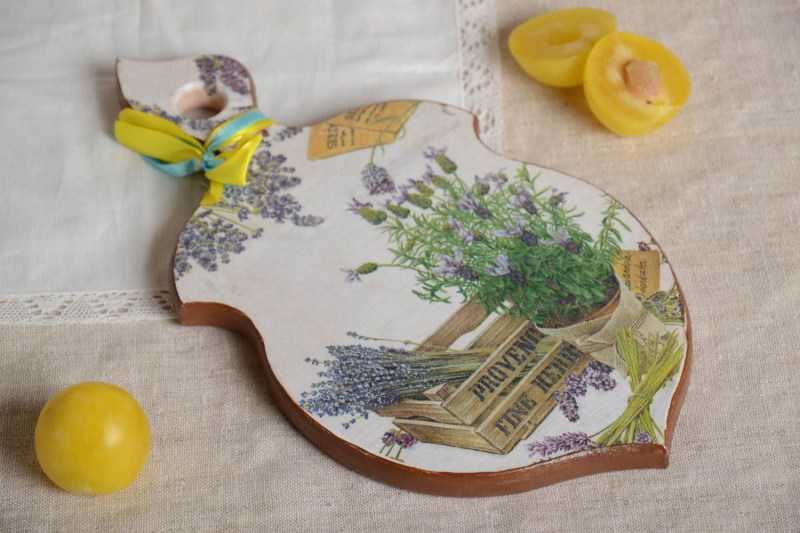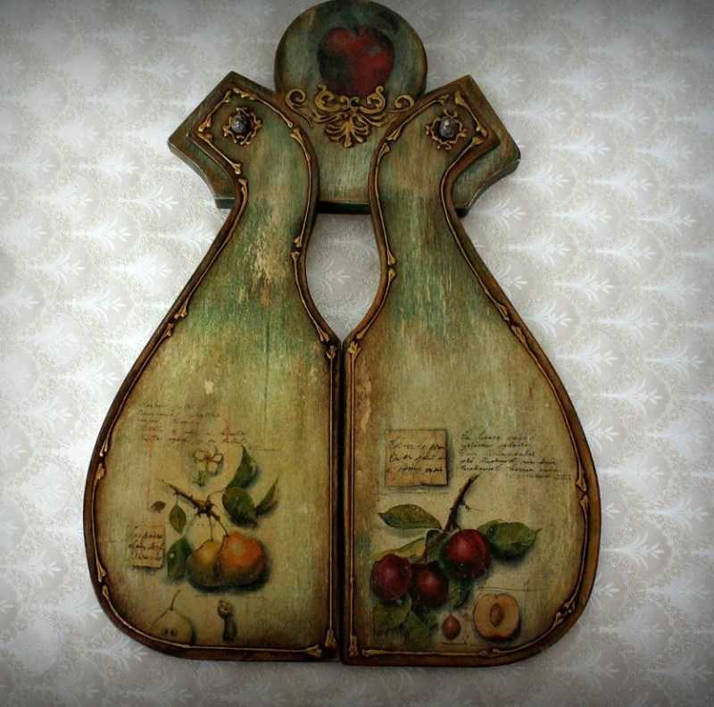 Сверху можно покрыть лаком, а можно добавить элементы с помощью эмалированной краски. Такую доску можно повесить на самое видное место в качестве декора. Картинки декупажа можно найти в этом материале.