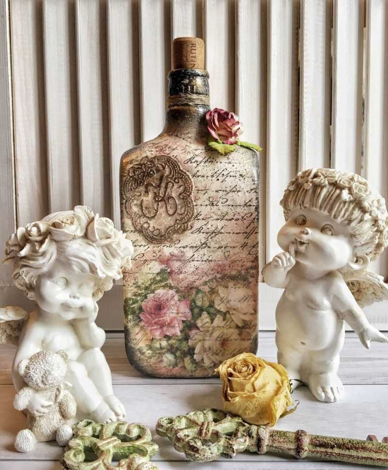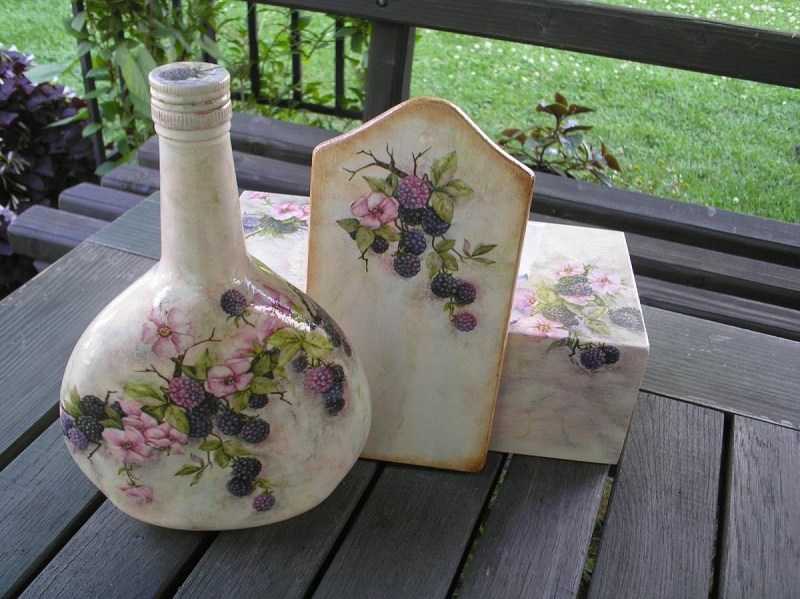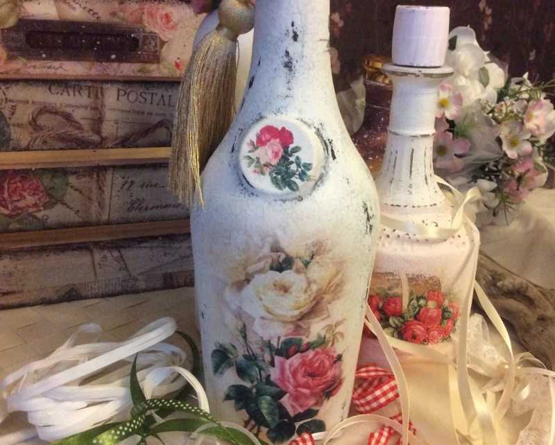 Чтобы на сосуде держалось сырье, ее заранее обрабатывают наждачкой, покрывают слоем грунта. Для украшения сосуда можно использовать несколько техник, включая прямой перенос, который был описан выше. Декупаж бутылки для начинающих позволит перенести даже фото.