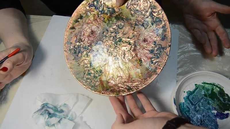 Чтобы тарелка смотрелась эффектно, края можно обработать блестящей россыпью. Наносят с помощью клея ПВА и толстой кисти.
