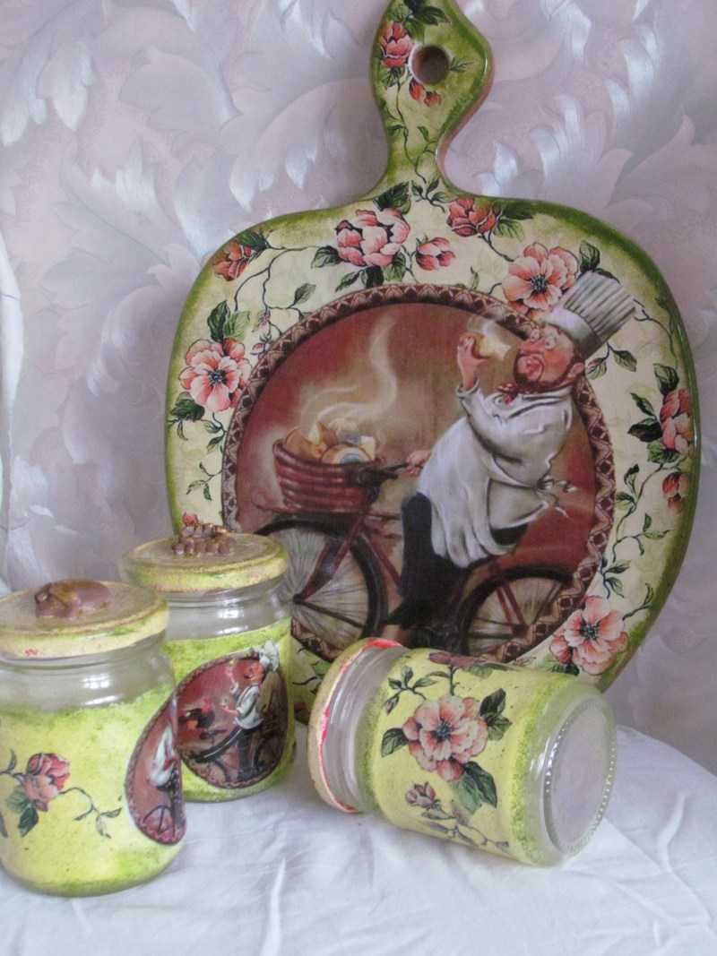Маленькие стеклянные баночки есть на каждой кухне. Умелицы делают из них сосуды для хранения трав и специй. Однако они не всегда хорошо вписываются в общий дизайн кухни, поэтому преобразить их можно с помощью прямой техники. Пошаговый декупаж для начинающих: