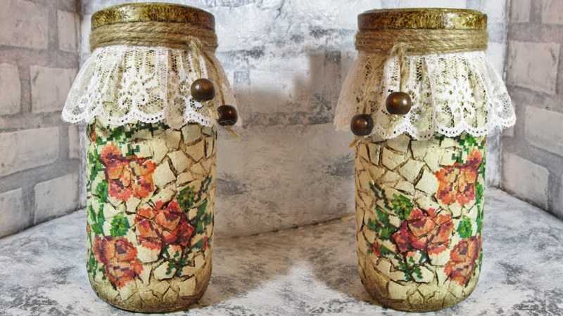 Дополнительные детали создаются с применением кисти и краски. Сложность состоит в том, что из-за небольших размеров банки, найти маленькое изображение на салфетках трудно. Придется частями переносить рисунок. Чтобы ознакомиться с деталями, рекомендуется смотреть видео от профессионалов.