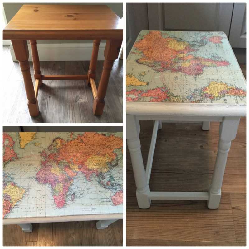 Старый журнальный столик можно также привести в современный и интересный вид. Для этого понадобиться несколько старых газет, можно даже с изображением, немного лака, белой матовой краски и кистей. Как делается: