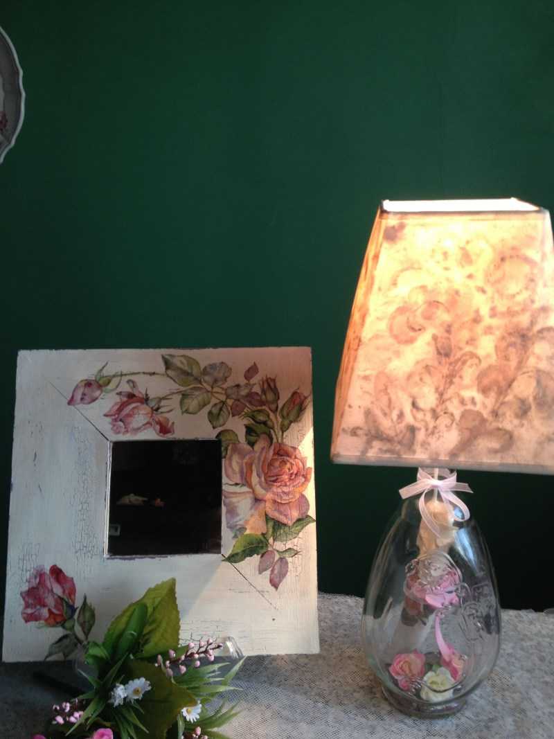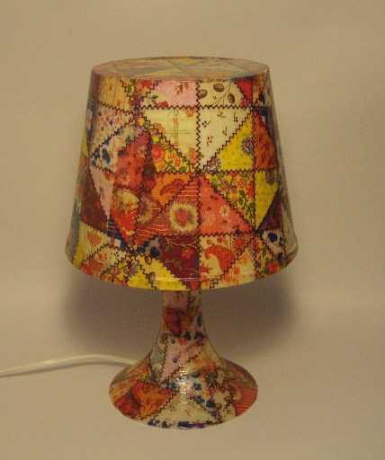 Если смелости приняться за стоящую в доме мебель пока не хватает, можно начать с настольной лампы. Абажуры и плафоны могут стать хорошей «тренировочной площадкой». Хорошо на них смотрится тканевый декупаж и его разновидность – декопатч. Здесь картинки (или лоскутки ткани) наклеиваются на всю поверхность, стыки между ними подчеркнуто заметны. Получается своеобразный пестрый коллаж.