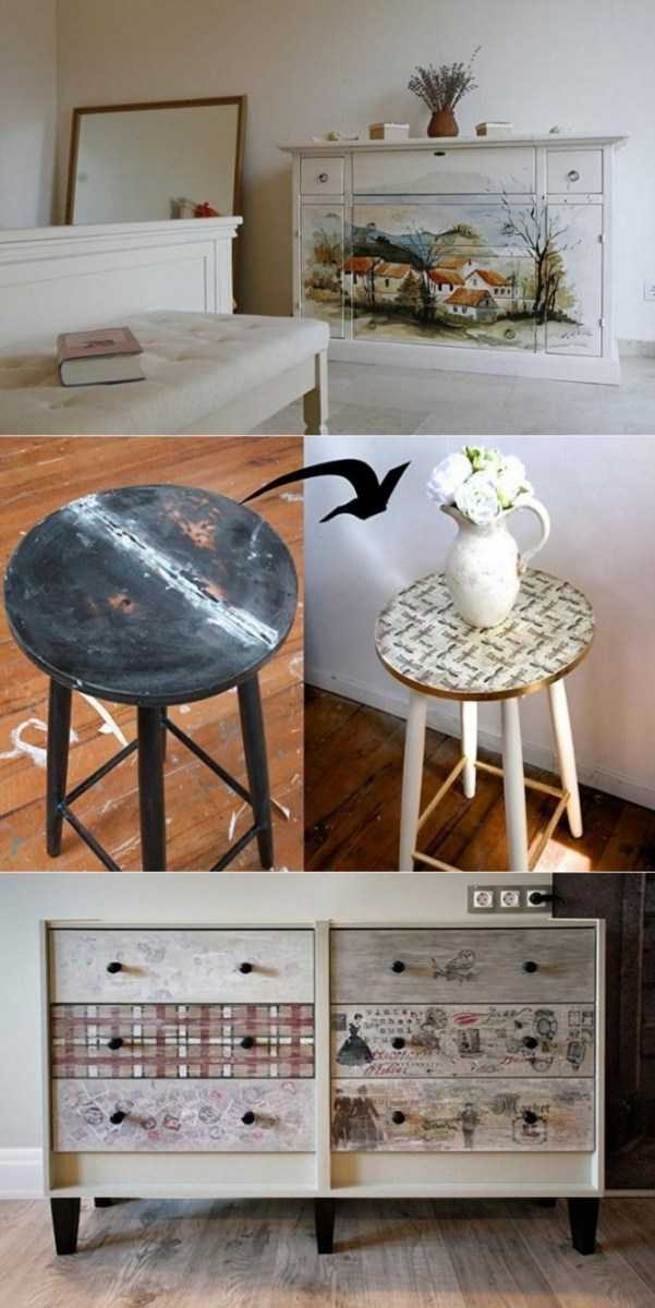 Присматриваясь к собственной мебели, полезно представить ее уже видоизмененной. Впишется ли она в существующее пространство? Фото декупажа мебели помогут понять, как может выглядеть переделка в жизни. А часто собственное вдохновение рождается при соприкосновении с чужими идеями.