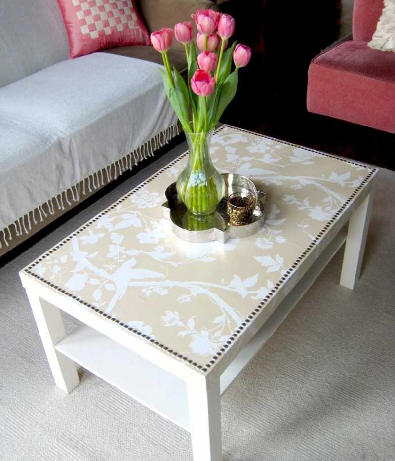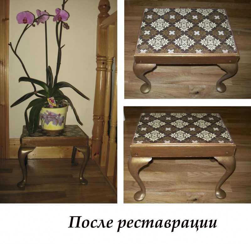 Пошаговое руководство по украшению стола аналогично табуреткам. Разница только в размерах рабочей поверхности и принципах размещения картинок. Если для стульчика достаточно одного большого фрагмента посредине, на столе их лучше размещать по углам. Можно декорировать и ножки стола мелким повторяющимся орнаментом.