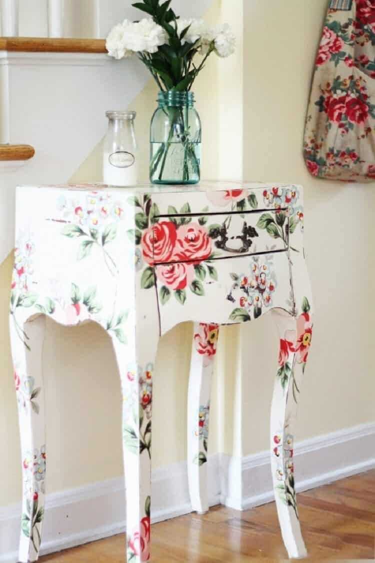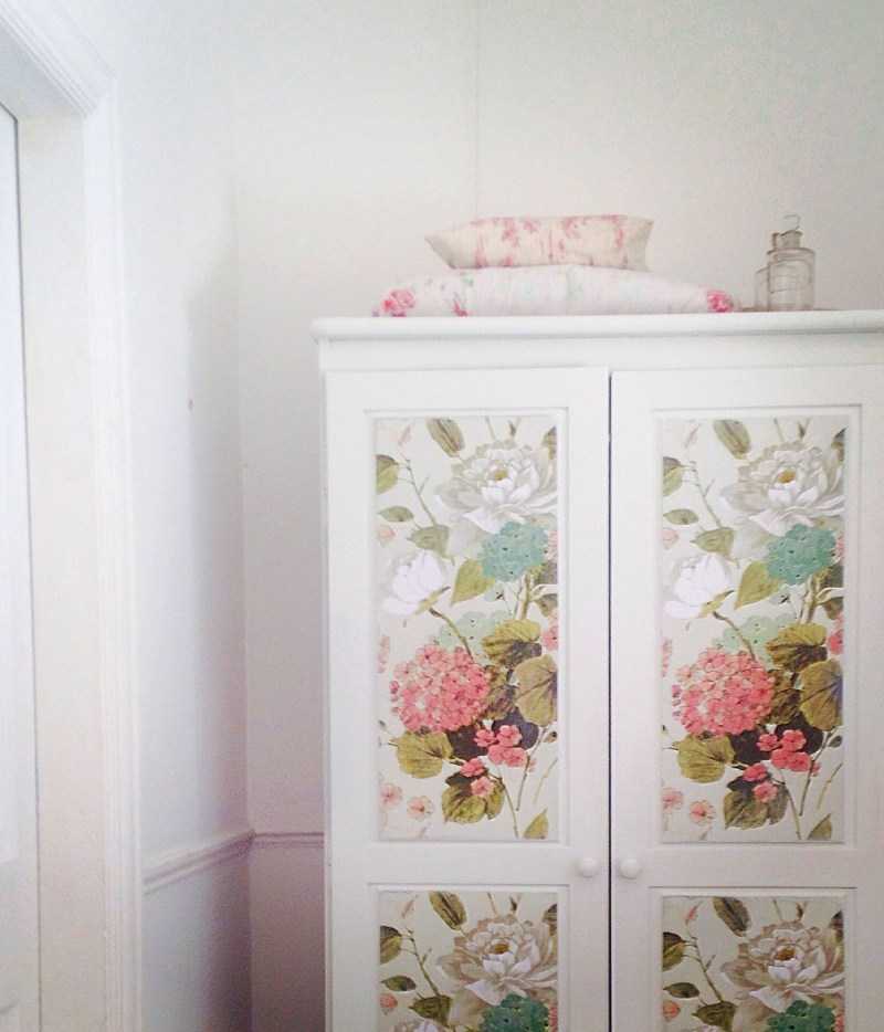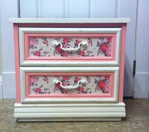 Декупаж мебели обоями под силу освоить даже начинающему реставратору. Благодаря плотной структуре обои не так размокают и рвутся в процессе приклеивания, как бумажные салфетки. Лучше начать с небольших поверхностей и оклеивать их вырезанными фрагментами – это называется лоскутной техникой. Удобно использовать для работы обрезки, которые остались после ремонта. Можно запастись и обоями с распродаж. Одного-единственного рулона хватит на много предметов мебели.