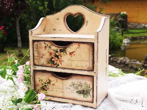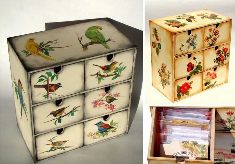- если в ящиках хранятся мелкие предметы, можно заранее организовать перегородки и ячейки для них, которые также декорировать.