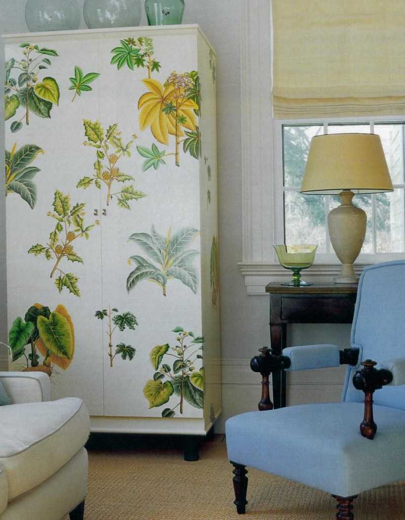 Особого уюта и тепла в помещении можно добиться, если декорировать мебель не бумажными рисунками, а тканевыми. Лучше подобрать несколько видов ткани, одинаковой по структуре, с перекликающимся рисунком.