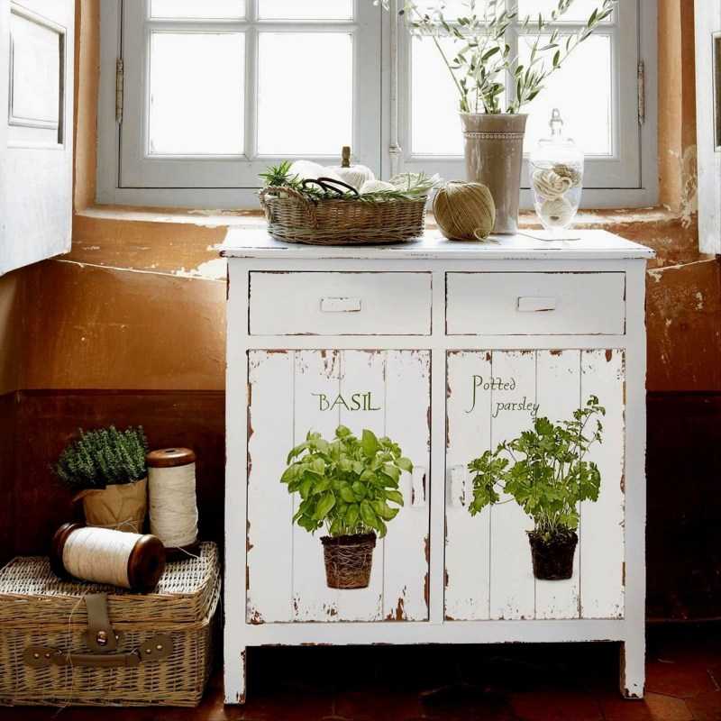 Душистые травы и пряности, лаванда и оливки, виноградные гроздья и яркие подсолнухи дополнят вкус любого блюда, поданного на декорированной таким образом кухне. Картинки либо одинаковы полностью, либо одинаковы, но отличаются по размеру. Например, букет роз на широких дверцах и меленькие розочки на выдвижных ящичках.