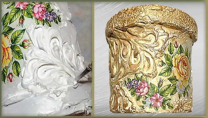 Прикрепляют вырезанный рисунок, дают немного подсохнуть и покрывают поверхность белком еще раз, но уже с картинкой. Белок надежно фиксирует декор, не тускнеет, не дает запаха и сохраняется несколько дней.