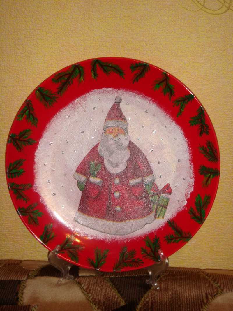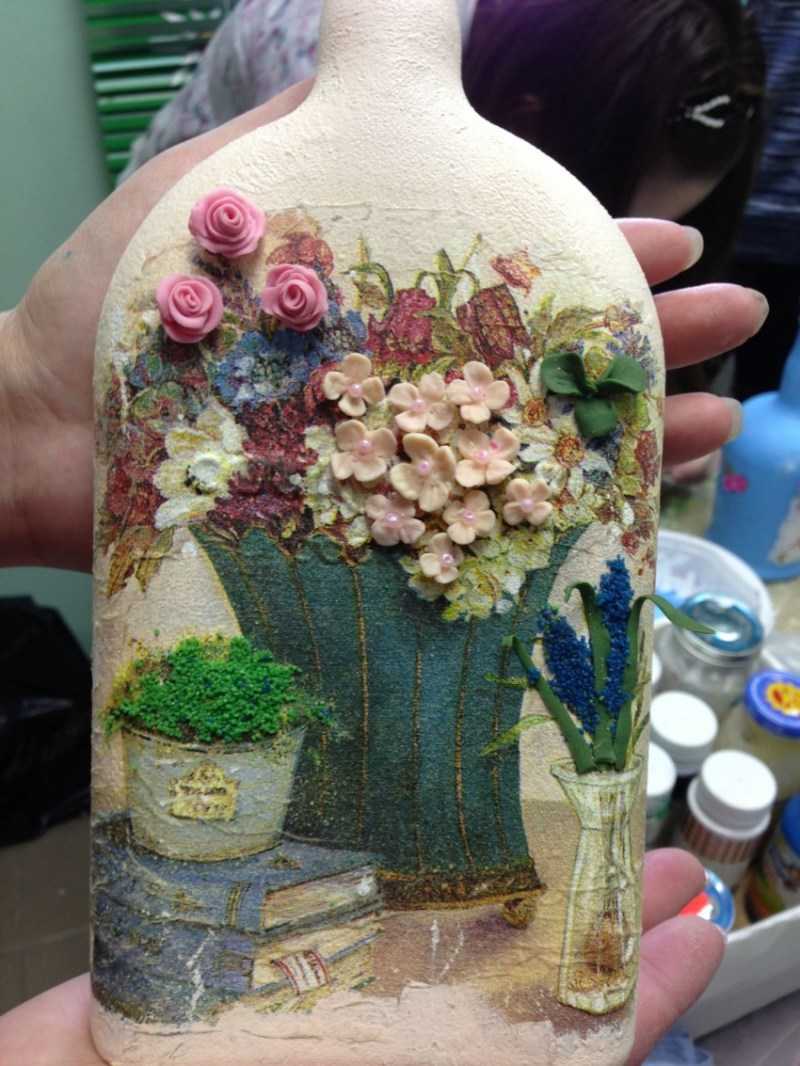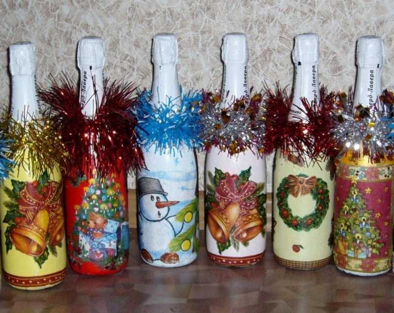Особого подхода в технике выполнения требуют поверхности с изгибами и скользкие, стеклянные или глазурованные, керамические поверхности. Очень нарядно смотрятся новогодние бутылки, задекорированные аппликациями.