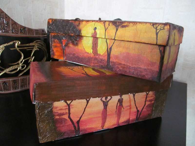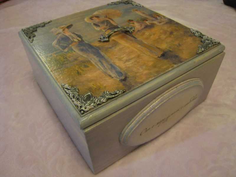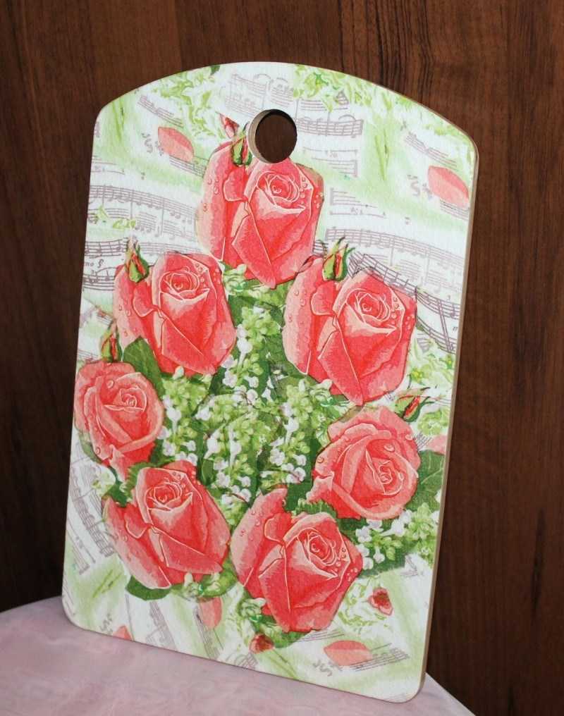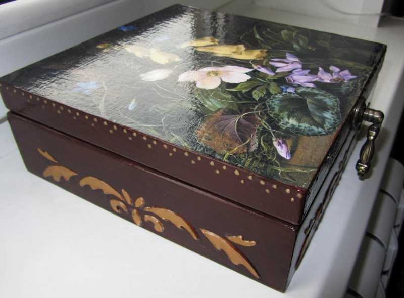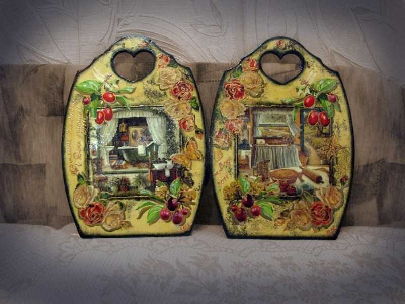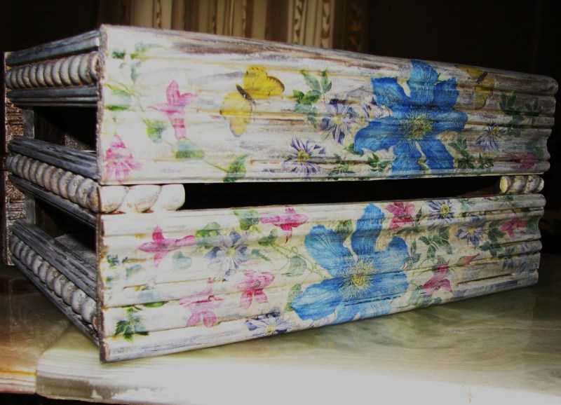Таким способом можно задекорировать деревянную шкатулку и получиться отличный сувенир, кухонный поднос. Изделия выдерживают влажное протирание, не тускнеют со временем, не деформируются.