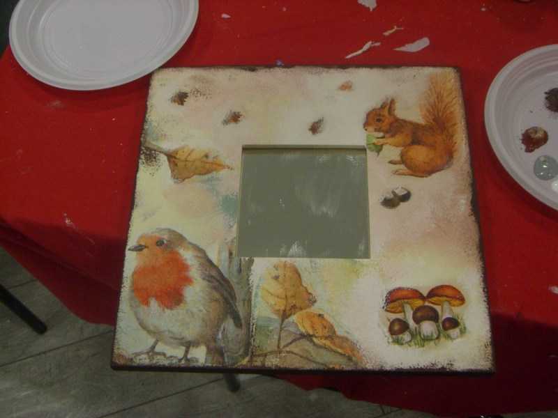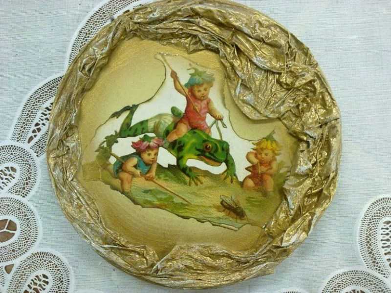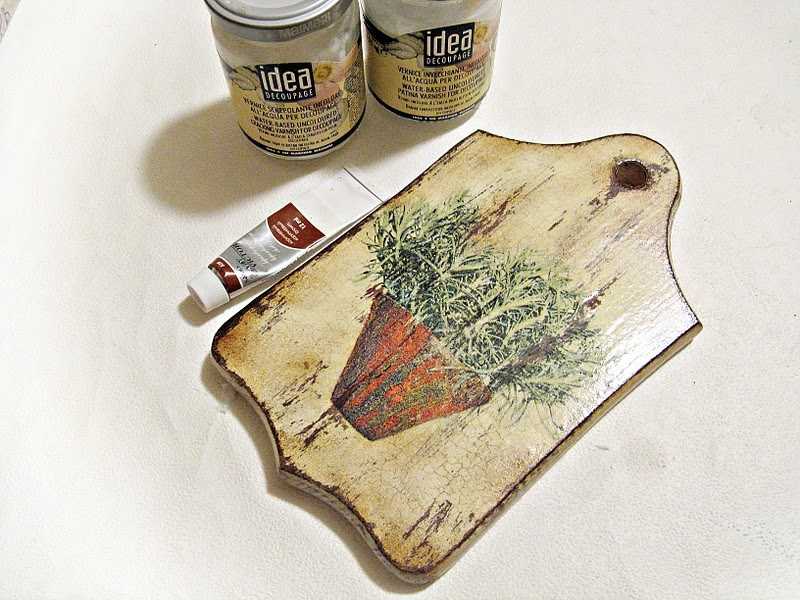 - Наносят картинку привычным способом. Вырезанный элемент наклеивают на проклеенную основу, разглаживают и наносят повторный слой клея. После полного высыхания покрывают лаком.