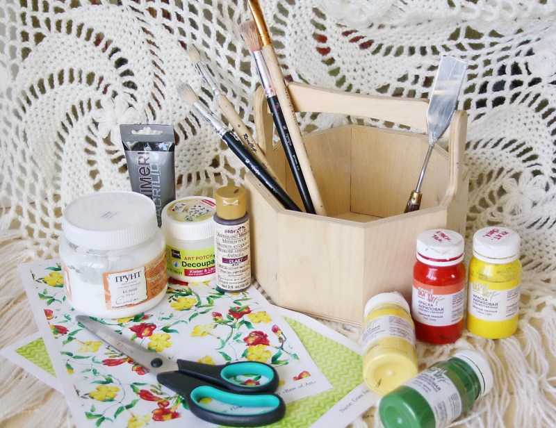 - Краски, акриловые, гуашь, акварель для придания фона декорируемой поверхности и дорисовке деталей;