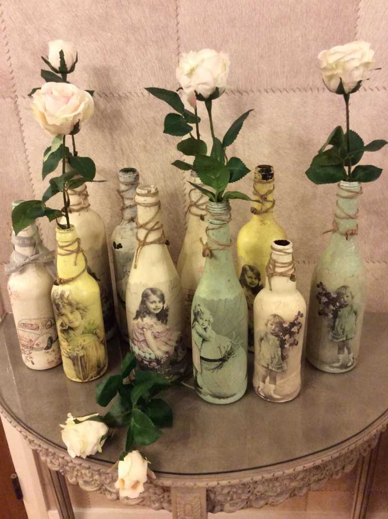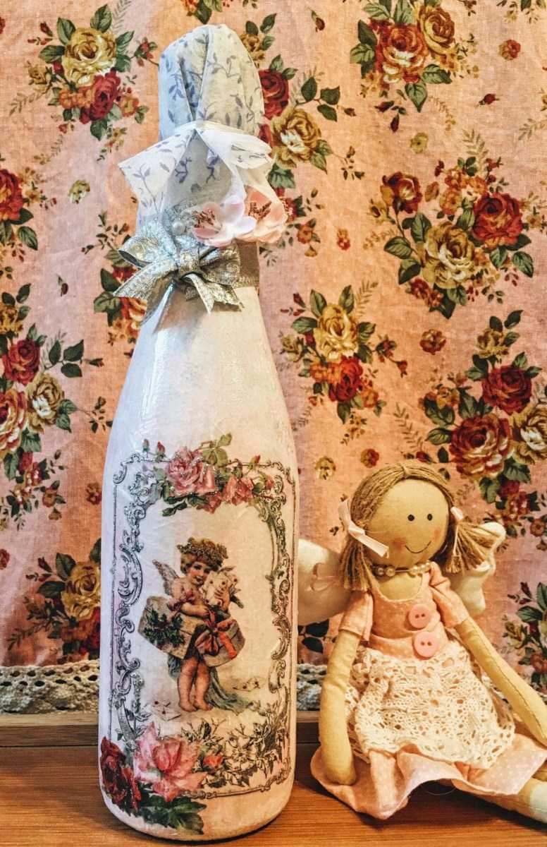 Подарочный вариант дорогого алкоголя в стиле ретро приятно удивит друзей и сотрудников. Декупаж бутылок салфетками точно так, как и декупаж тарелок салфетками требует иного подхода в нанесении.