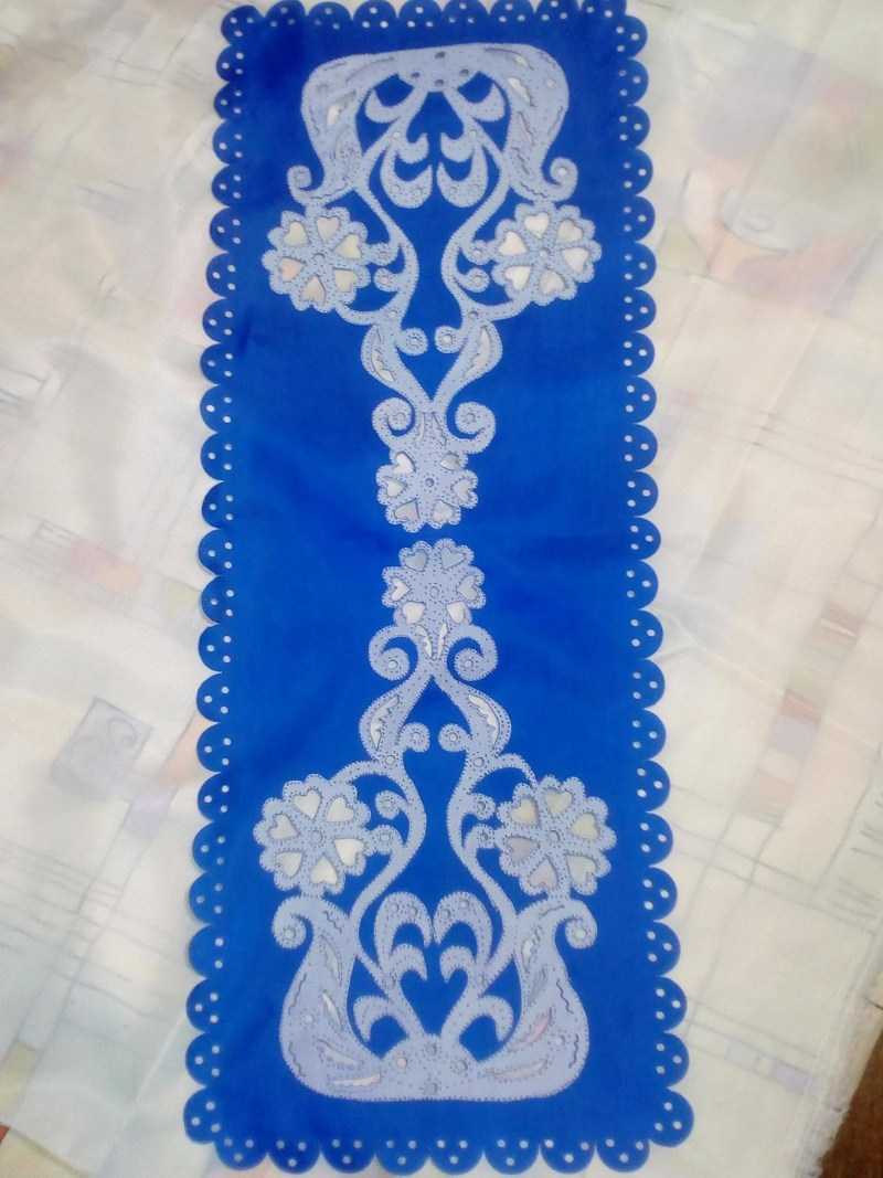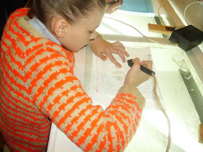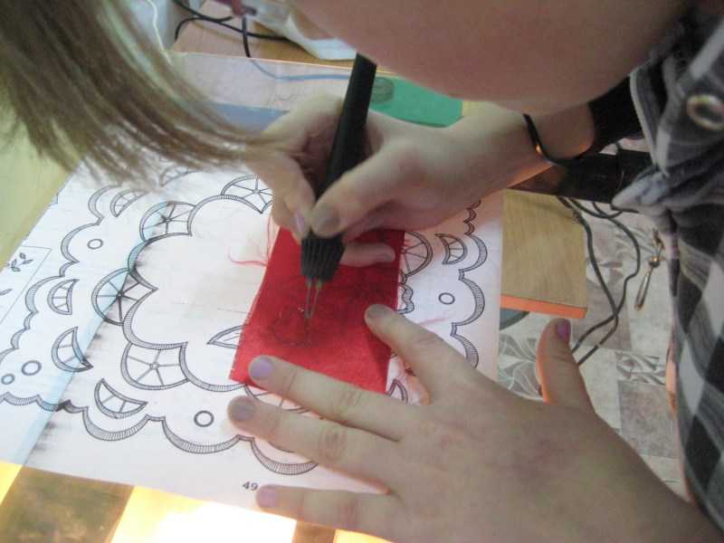 Необязательно работать лишь с выжигателем. Можно использовать и иглу. Вышитое изделие будет смотреться намного привлекательнее. Другой вариант – приклеить вырезанную вышивку на обработанную машинкой для выжигания ткань.