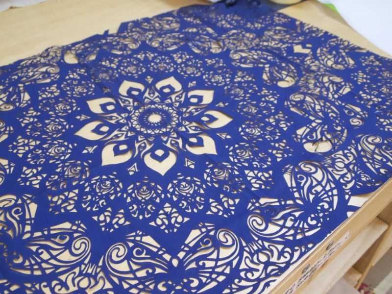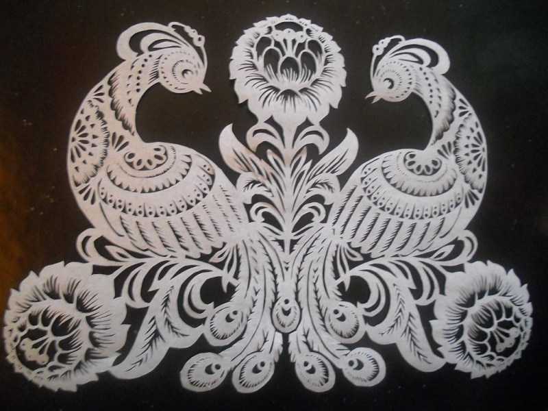 Для работы требуется трафарет в виде рисунка на бумажном листе. Приготовив необходимые вещи, можно приступать к сотворению произведения. Вначале нужно вырезать все элементы какой-либо одной расцветки.