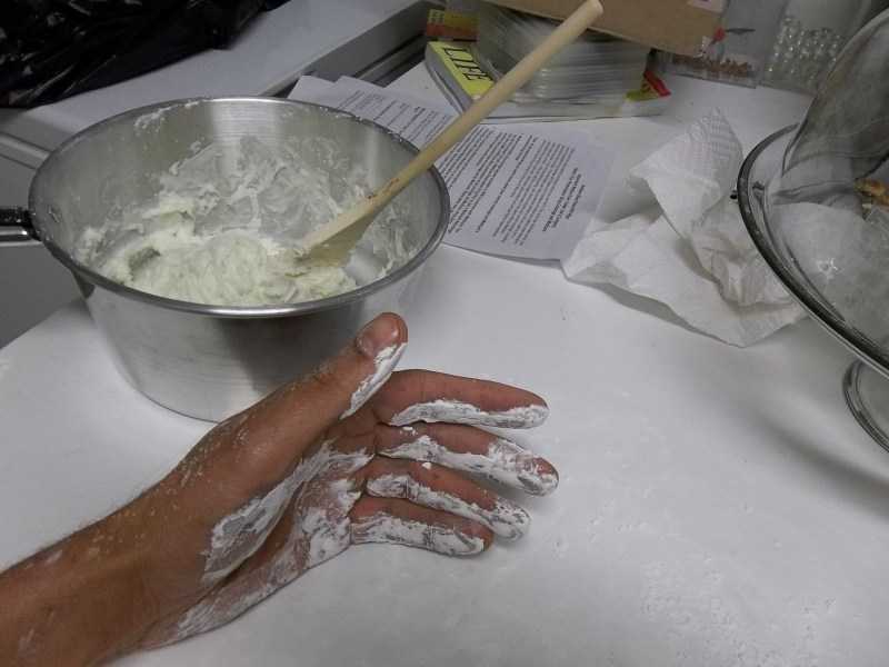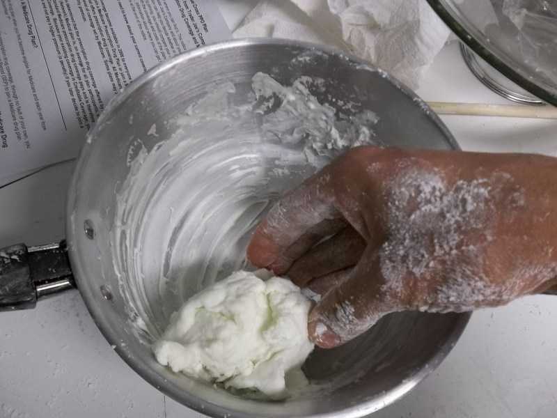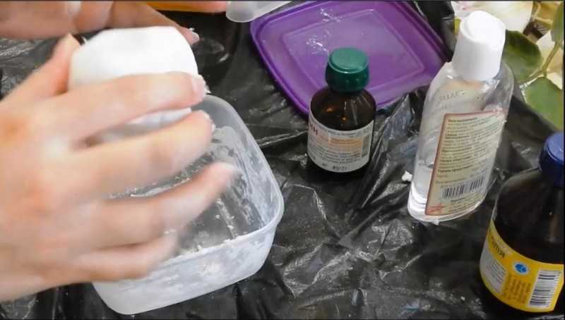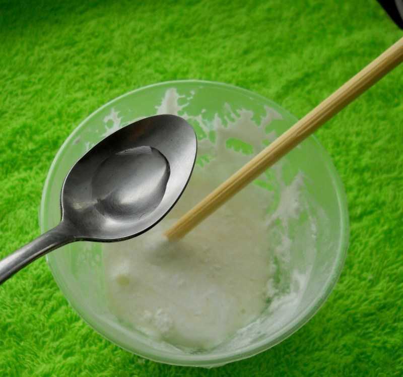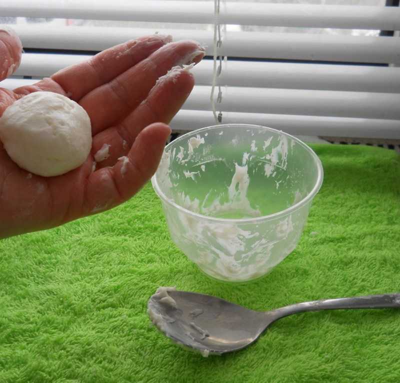 Перед тем как начать работу, руки необходимо смазать кремом, это делается для того, чтобы будущая смесь хорошо отцеплялась. Для приготовления подберите посуду. Подойдет стеклянная или тефлоновая тара. Алюминиевая посуда не подходит для работы.