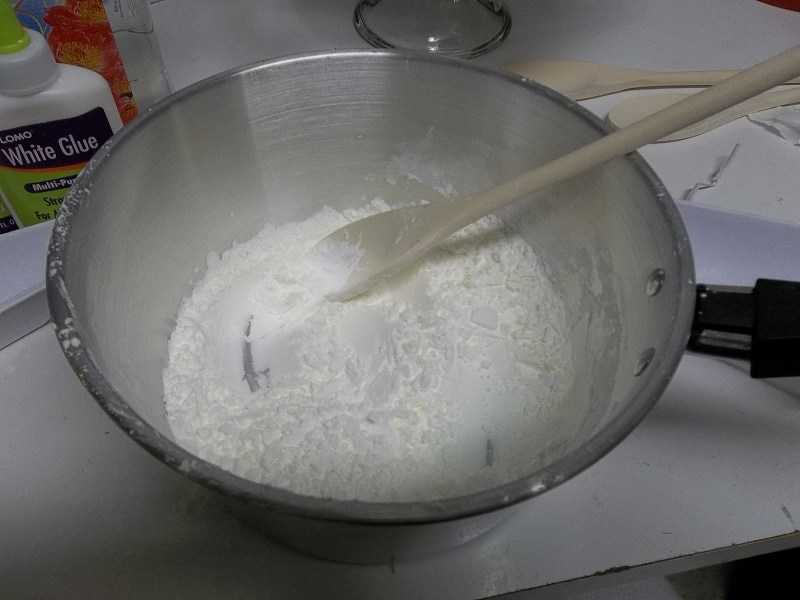 Этап 1. В чашу поместить один стакан мела и один стакан крахмала. Влить клей, смотреть по консистенции (должна получиться густая сметана).