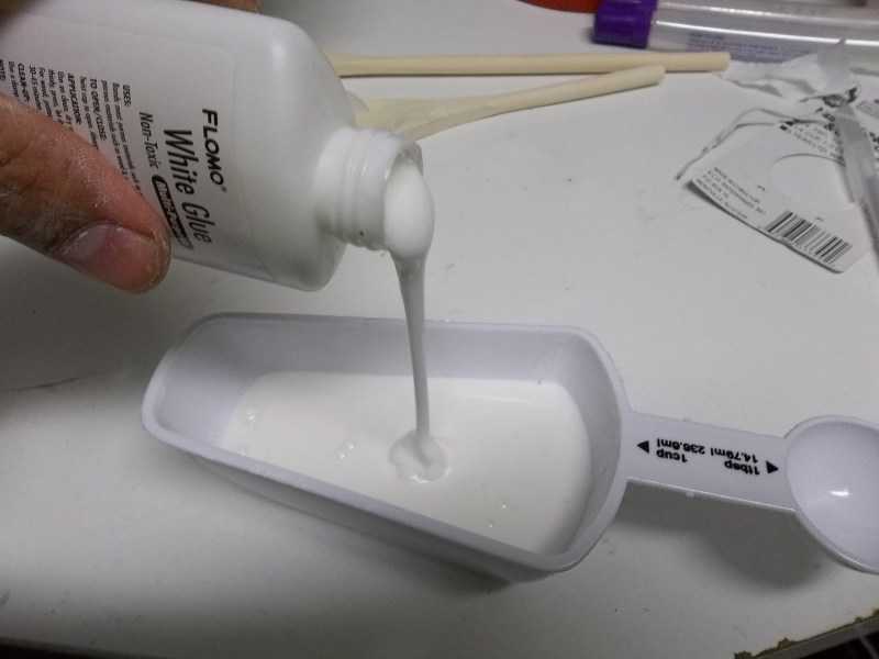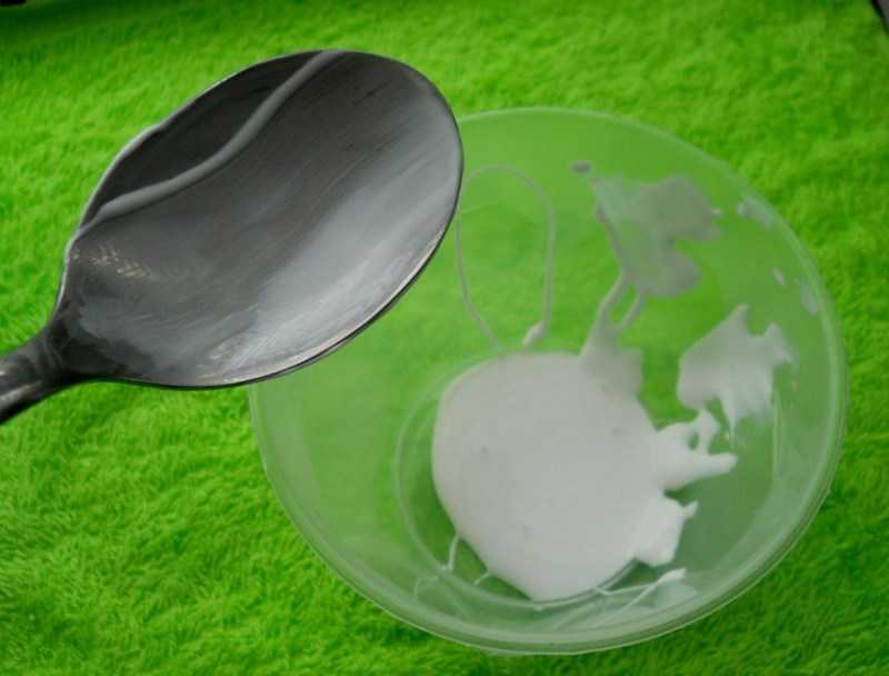 Включить огонь (средний) и поставить на плиту посуду, в которой будет готовиться смесь. Влить 1 стакан клея ПВА и сразу же туда отправить 1 чайную ложку крема и чайную ложку глицерина. Интенсивно перемешать, чтобы все компоненты соединились.