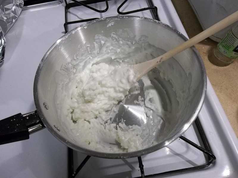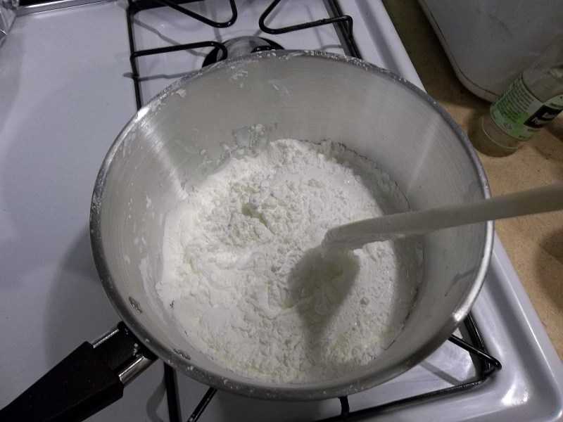 Постепенно ввести 1 стакан крахмала. Перемешать. Сначала смесь может напоминать зернистый творог, но в процессе нагрева она приобретет однородную массу и образует единый комок.