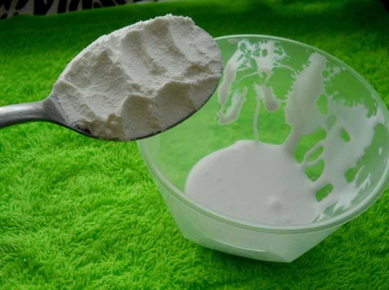 В тарелку насыпать две столовые ложки крахмала и добавить вазелин. Соединить компоненты. Добавить щепотку соды и все перетрать между собой.