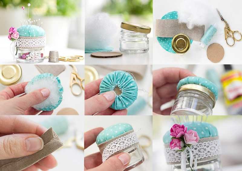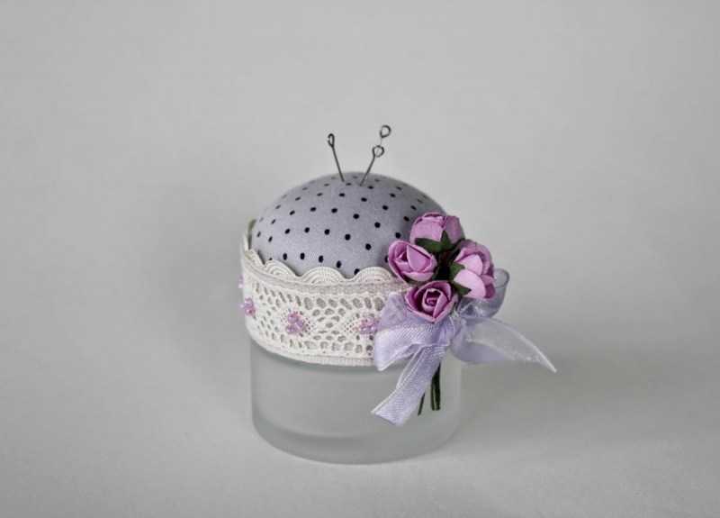 - Закрепить красивую игольницу, заклеив боковую часть крышки тесьмой.