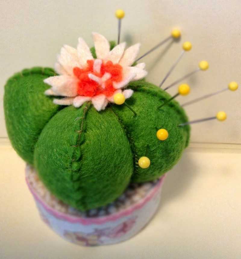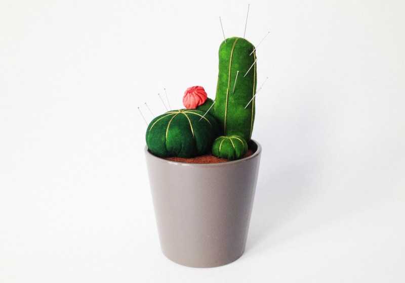 Провязав 28 ряд, вязку кактуса заканчивают, сшивая начальный и крайний ряды. Через нижнее отверстие изделие наполняют синтепоном. Далее растение пришивают к вязаному кругу из чёрной пряжи. В сделанный ранее горшочек укладывают вату и пришивают заготовку с кактусом. Для большего эффекта игольницу украшают вязаными цветочками.