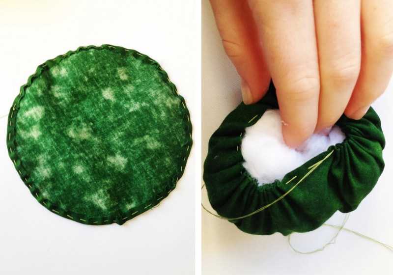 - Пришейте тканевую заготовку к диску штопальными стежками.