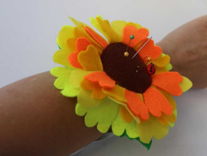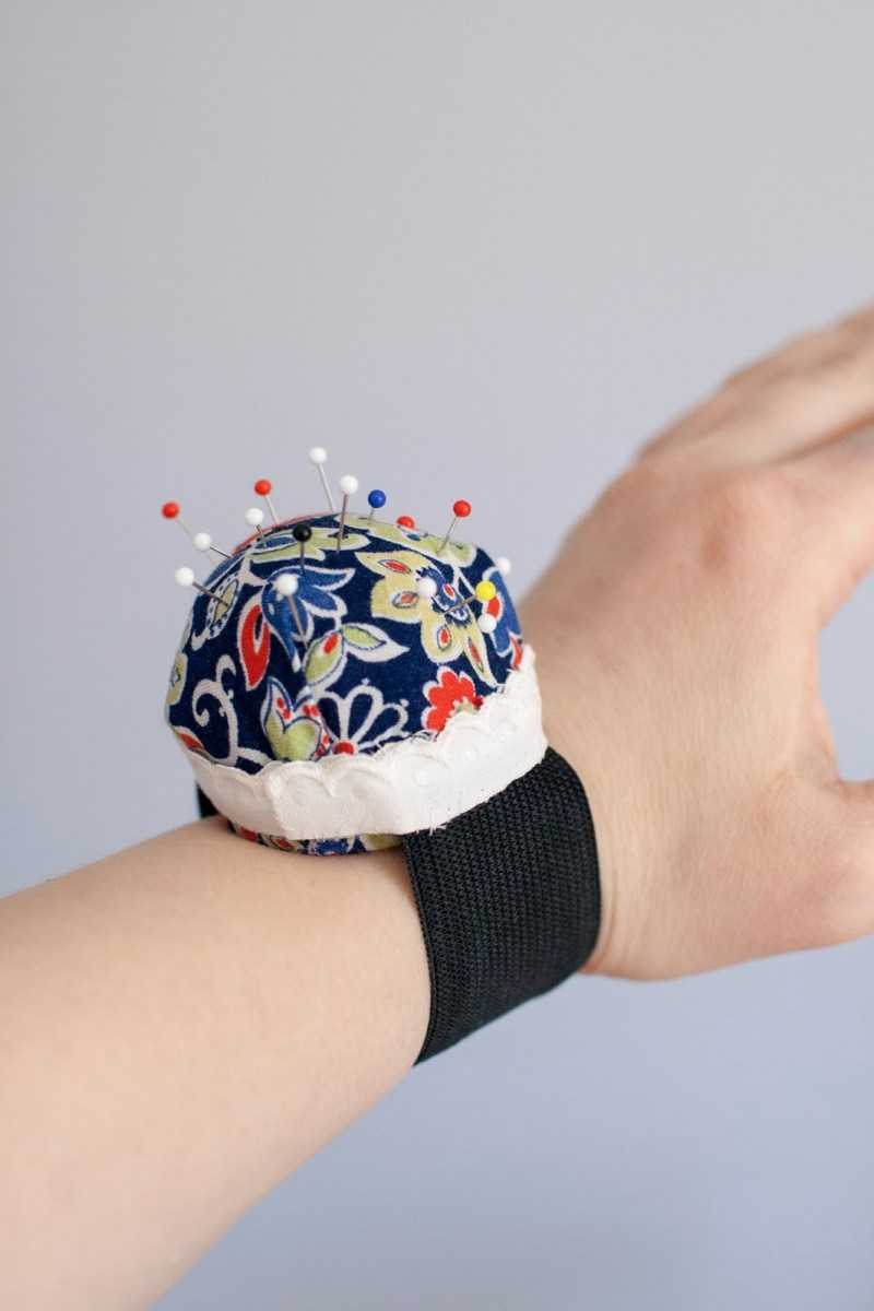 - Пришейте липучку и сделанную ранее круглую подушечку. Простая игольница на руку готова!