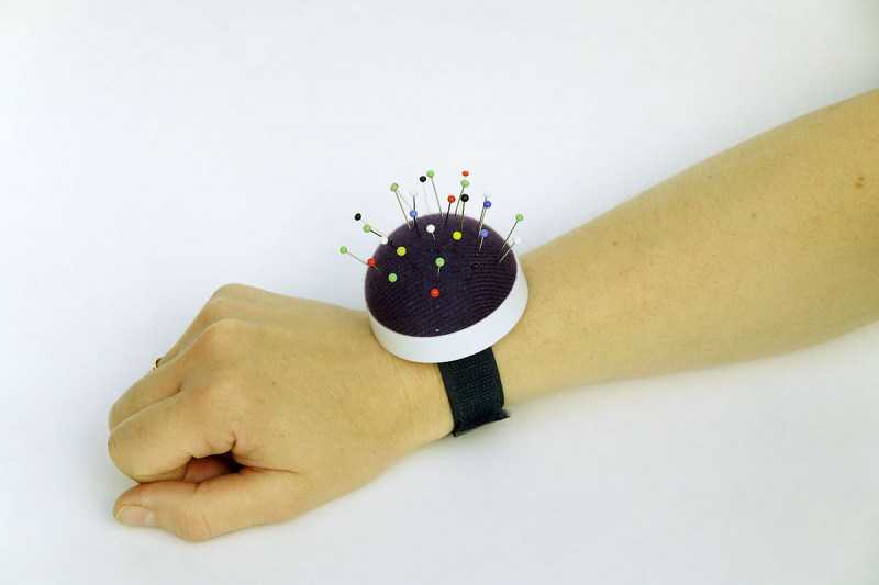 Ниже представлена несложная техника изготовления наручной игольницы из пластиковой крышки и резинки: