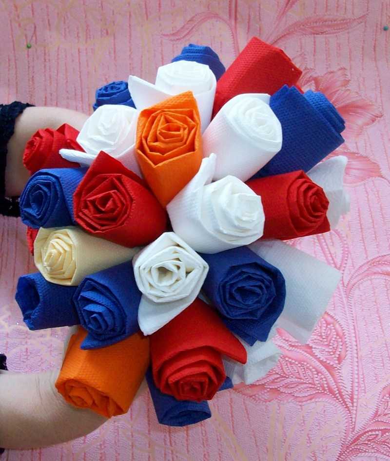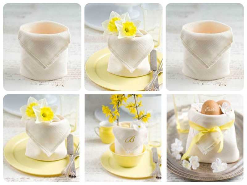 Если тканевая салфетка большая, а виновники торжества и гости обожают цветы, то полотно может послужить сосудом. Для формирования салфетки в емкость придется: