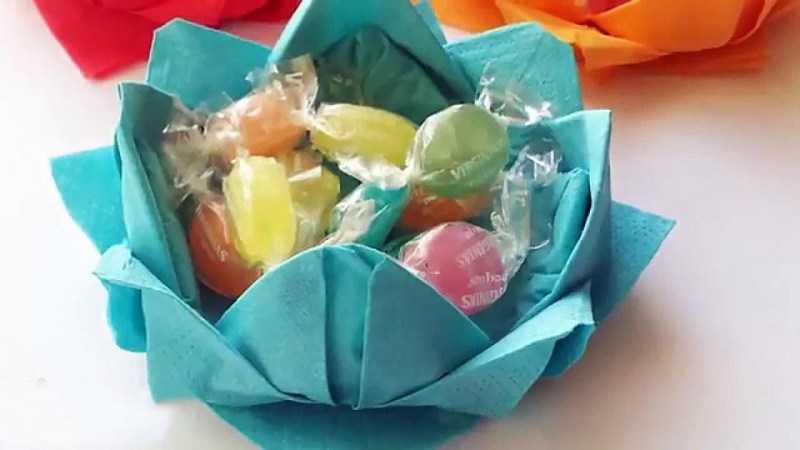 В итоге получается распустившийся цветок, на который удобно и интересно ставить бокалы и стаканы. Также в такую самодельную емкость можно складывать конфеты.