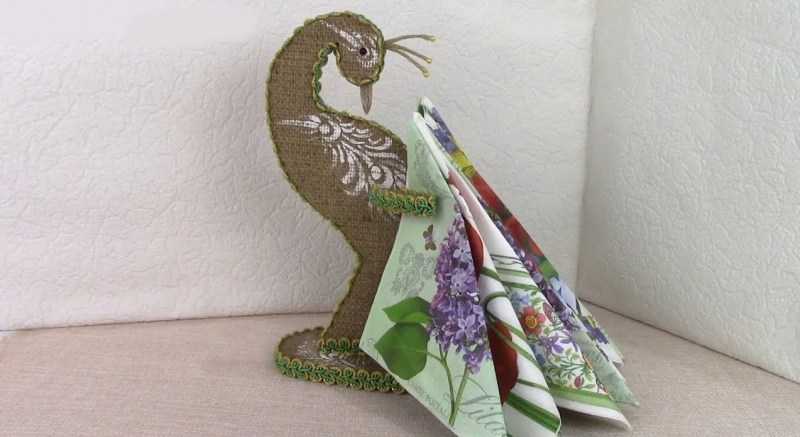 Тканевые салфетки часто располагают узорами. Соответствующим обрамлением трудно не воспользоваться, когда надо создать павлина.