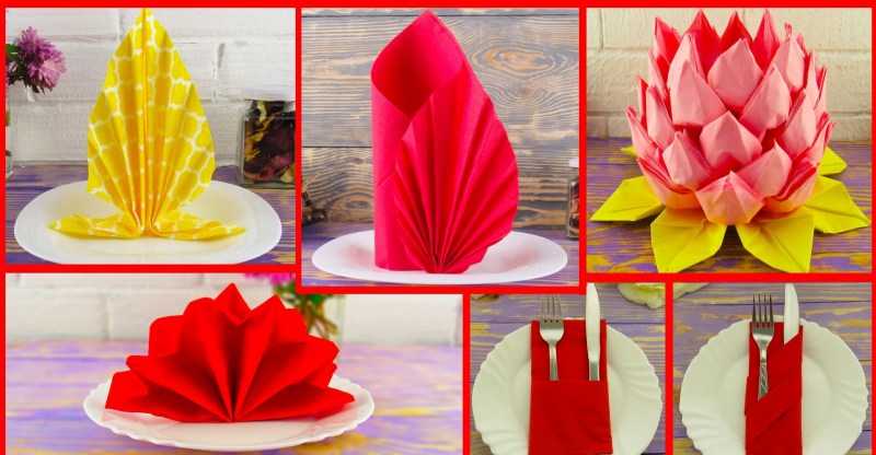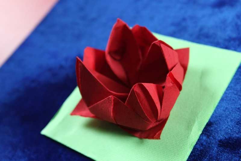 Не беда, если живых цветов очень мало или их нет вообще. На фото, как красиво сложить салфетки, часто вырисовывается астра из алой тканевой салфетки: