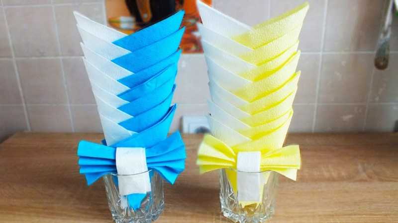 - Сначала длинная салфетка складывается в веер и погружается в длинный бокал или стакан;