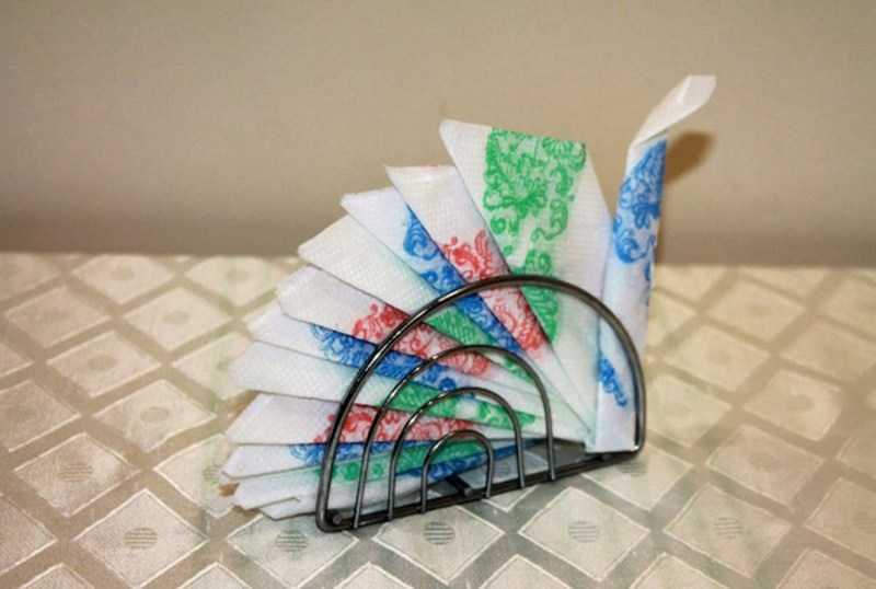 Ведь королевская птица буквально пестрит красками. Правда, павлина придется формировать из двух салфеток. Причем они могут быть как одинаковыми, так и разными.