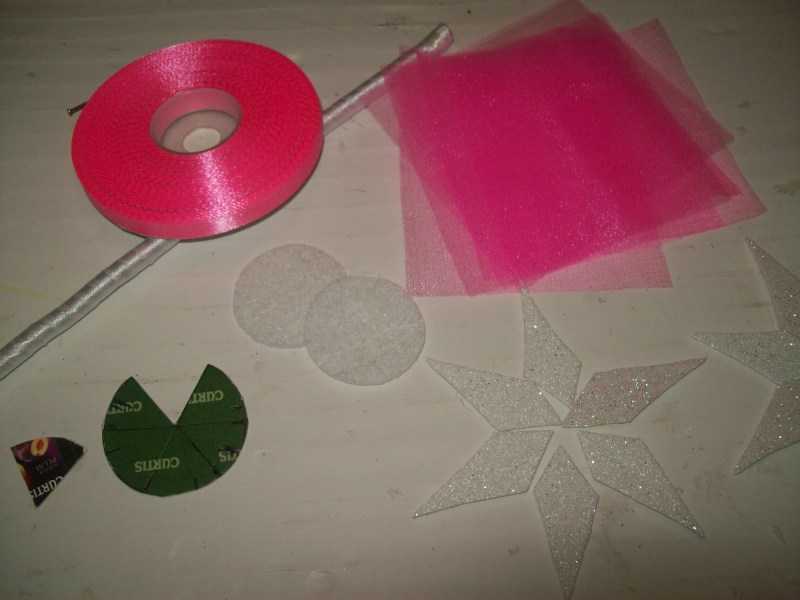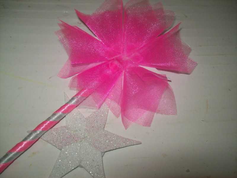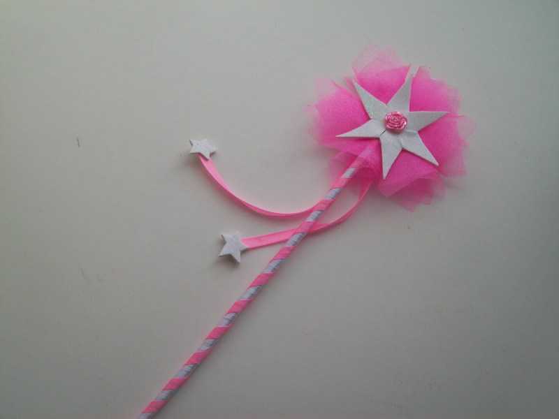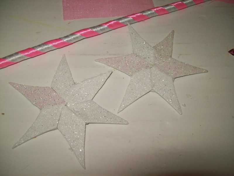 На конце палочки можно смастерить звезду розового или золотого цвета, которая делается из картона. Палочка феи волшебницы должна быть милой и симпатичной, в белых, розовых, серебристых и золотистых цветах.