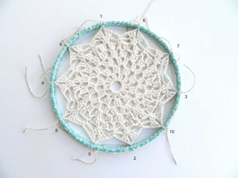Подобным способом делаем со всей окружностью до конца первого ряда. Второй и третий ряд делаем подобным способом, но крепим нить к предыдущему ряду. В центре закрепляем нить узелком. Основа для нашего ловца готова.