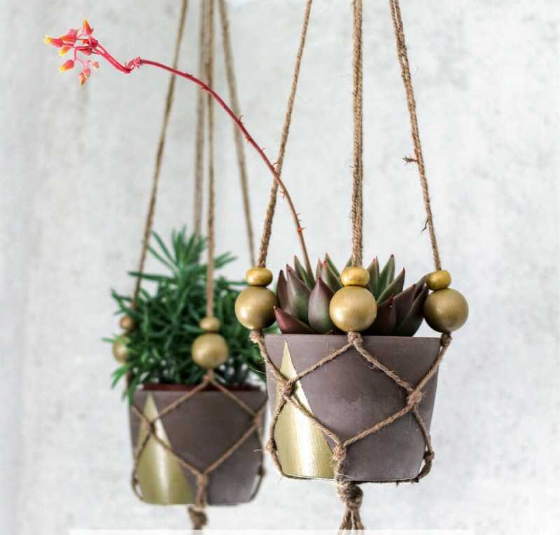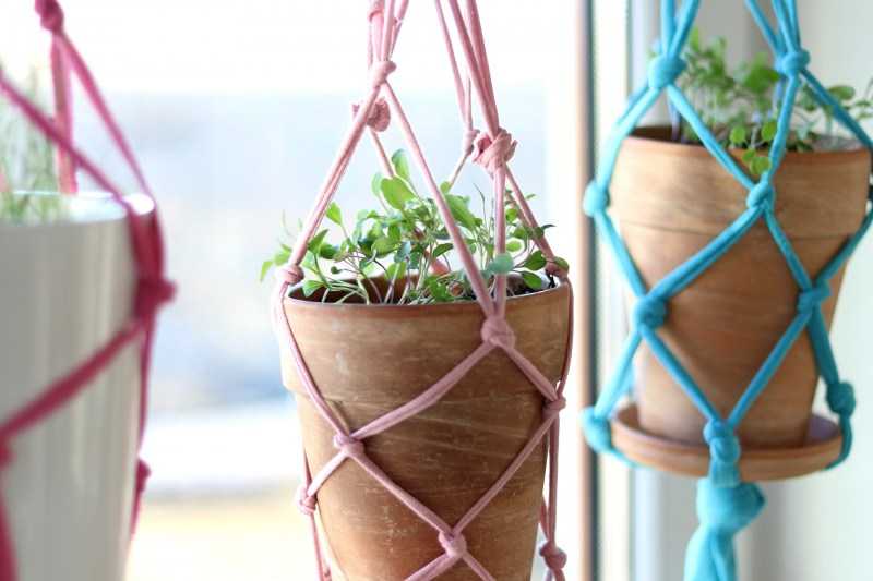 В качестве макраме для начинающих подойдет изготовление кашпо. Готовое кашпо представляет собой оплетение особым способом вазона, цветочного горшка на длинных подвесках, также украшенных плетением макраме.