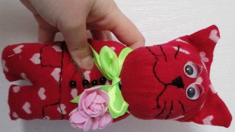 Войлочный нос пришивается к ткани с помощью «бегущего» стежка. С помощью стебельного стежка делается улыбка кота. Наконец, сшивается сердце из войлока вышивальной нитью с помощью «бегущего» стежка.