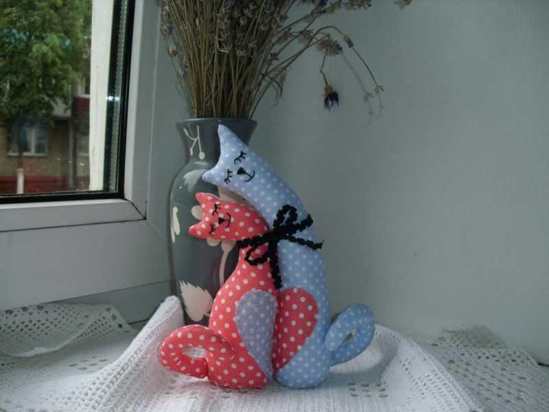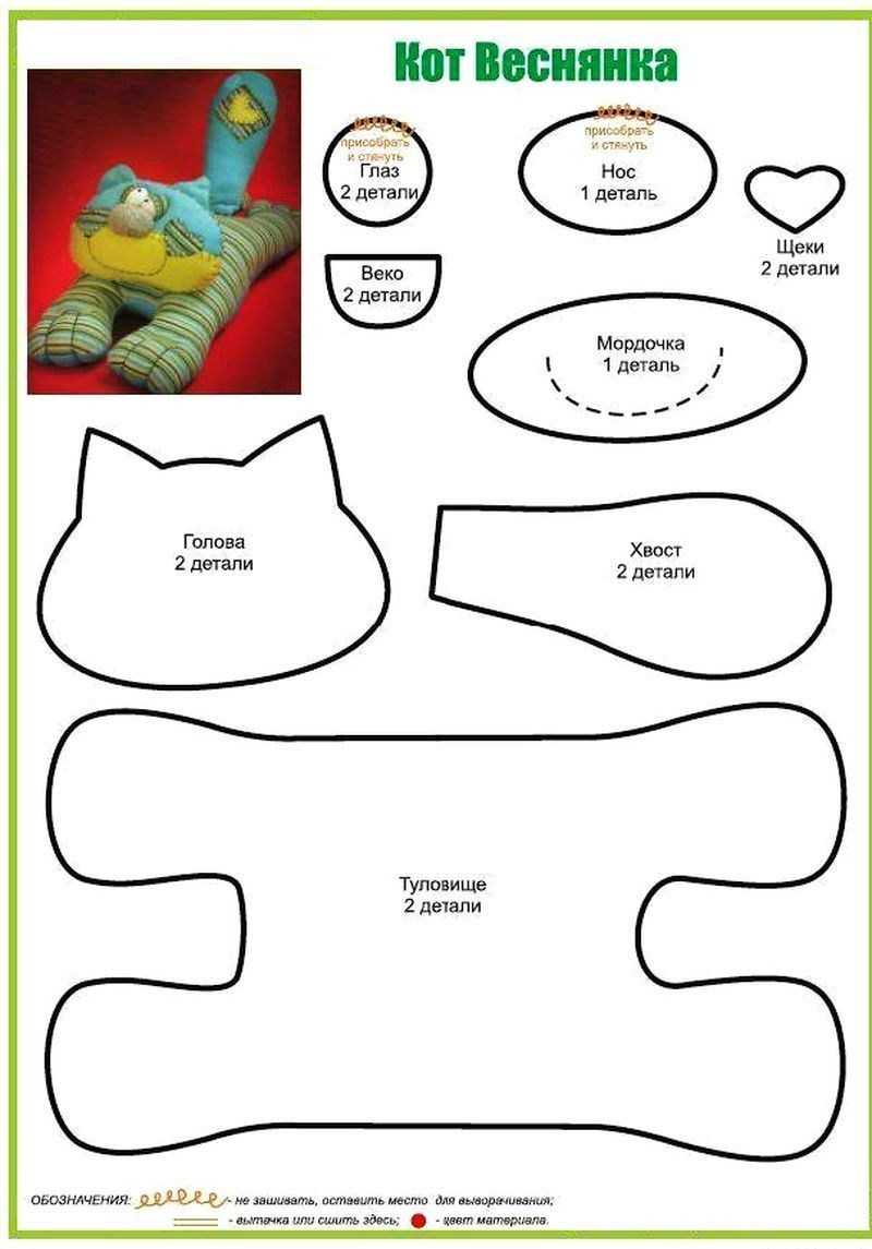 Сначала необходимо распечатать и вырезать шаблон. Теперь надо сделать переднюю часть тела кота. Пришиваются пуговицы для глаз. Необходимо убедиться, что пуговицы хорошо пришиты к ткани, особенно если игрушка изготавливается для маленьких ребят (хотя лучше вообще не использовать пуговицы и подобные предметы, так как ребенок может их проглотить).