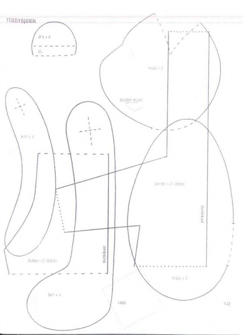 Темной нитью прошиваются оставшиеся участки головы и животика плюшевого мишки. Голова плюшевого мишки состоит из 4 фрагментов, 2 ушей и мордочки. Сначала сшиваются две части шаблона вместе: «перед головы» и «задняя часть головы».