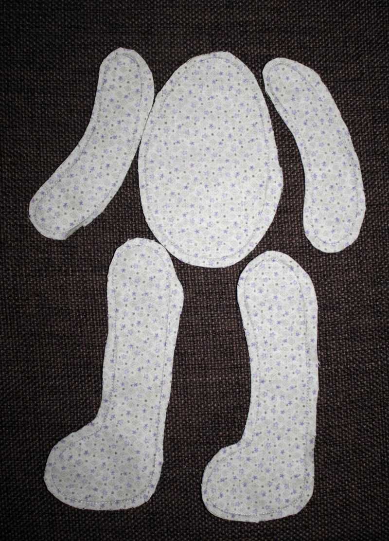 Вместе помещаются две части ушей с правой стороны. Шьются вместе слева и справа (не внизу). Отрезается верхняя часть (нужно делать аккуратно, чтобы не порезать шов). После делается верхний шов с правой стороны. Кладется немного наполнителя (очень мало). Сшиваются ноги, руки и хвост. Их нужно поместить правой стороной вместе. После они переворачиваются и забиваются наполнителем.